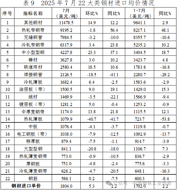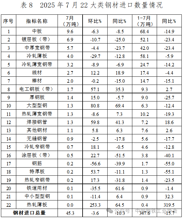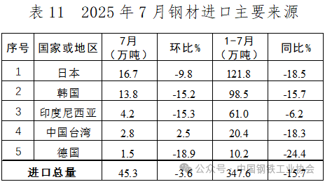 2025年7月,我國鋼材進口規(guī)模持續(xù)萎縮,為近10年以來單月進口量最低水平。各主要品種進口量環(huán)比大多下降,進口前5位的品種占當月我國鋼材進口總量的比重較上月有所下降。7月,我國鋼材的主要進口來源及結(jié)構(gòu)仍保持穩(wěn)定,除自中國臺灣進口鋼材環(huán)比回升外,自其它主要國家進口鋼材數(shù)量環(huán)比均下降,且降幅大于總體水平。
