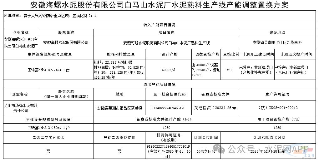 根據(jù)《水泥玻璃行業(yè)產(chǎn)能置換實(shí)施辦法(2024年本)》等文件要求,安徽海螺水泥股份有限公司白馬山水泥廠1條4000t/d水泥熟料生產(chǎn)線通過(guò)補(bǔ)產(chǎn)能方式將產(chǎn)能增加到5250t/d,置換產(chǎn)能來(lái)自蕪湖市華楊水泥有限責(zé)任公司、蕪湖瑞信水泥有限公司,置換比例為2:1。