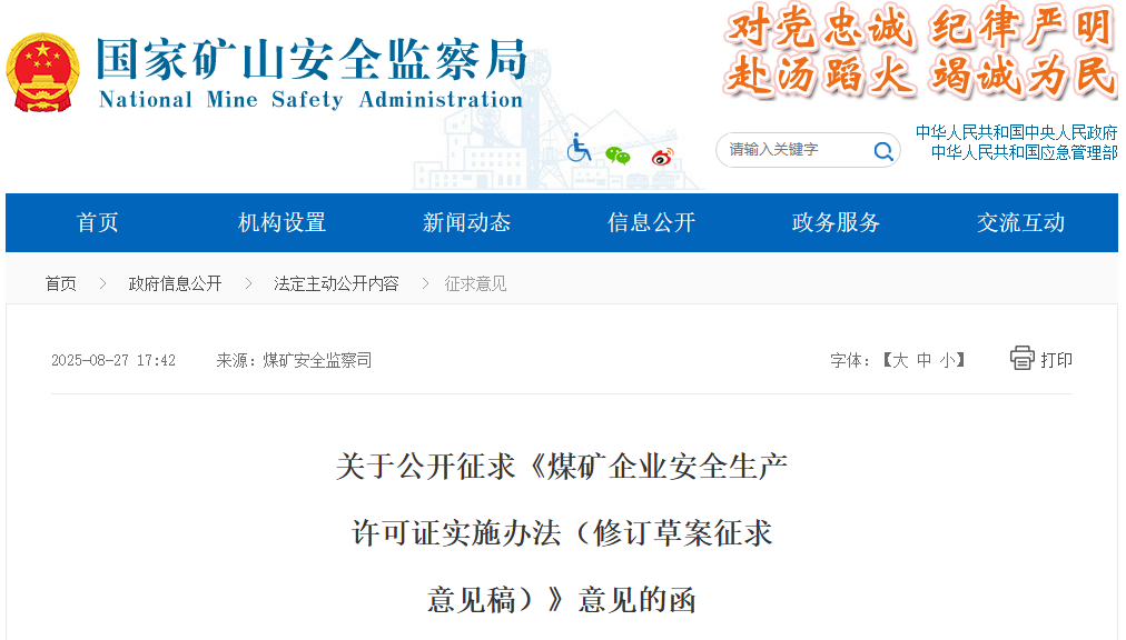 為進一步加強煤礦安全生產(chǎn)許可證管理工作,國家礦山安全監(jiān)察局起草了《煤礦企業(yè)安全生產(chǎn)許可證實施辦法(修訂草案征求意見稿)》(附件1),現(xiàn)向社會公開征求意見,截止時間為2025年9月28日,請?zhí)顚憽墩髑笠庖姺答伇怼罚ǜ郊?),并發(fā)送至電子郵箱:mkaqxkz@163.com。