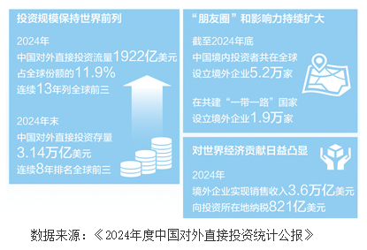 中國是吸引外資的大國,也是對外投資大國。2024年中國對外直接投資流量為1922億美元,連續(xù)13年列全球前三。隨著產(chǎn)業(yè)結(jié)構(gòu)升級(jí),高新技術(shù)產(chǎn)品、高端裝備、綠色低碳產(chǎn)品成為中國制造“出?!毙略鲩L點(diǎn)。中國企業(yè)“出海”持續(xù)向新向綠,“中國投資”展現(xiàn)出強(qiáng)大的韌性和活力。
