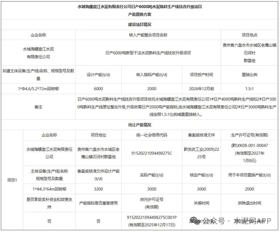 另據(jù)此前貴州工信廳發(fā)布,水城海螺盤江水泥6000t/d技改升級項目產(chǎn)能置換方案如下:
