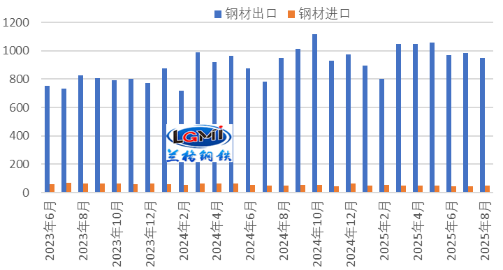 2025年8月我國鋼材月度出口呈現(xiàn)同比微幅增長態(tài)勢。據(jù)海關(guān)總署統(tǒng)計數(shù)據(jù)顯示,出口方面,8月份,我國出口鋼材951.0萬噸,同比增長0.1%,增幅較上月回落25.5個百分點;1-8月,我國出口鋼材7749.0萬噸,同比增長10.0%,增幅較上月回落1.4個百分點。進(jìn)口方面,8月份,我國進(jìn)口鋼材50.0萬噸,同比下降2.0%,降速較上月收窄7.6個百分點;1-8月,我國進(jìn)口鋼材397.7萬噸,同比下降14.1%,降幅較上月收窄1.6個百分點。