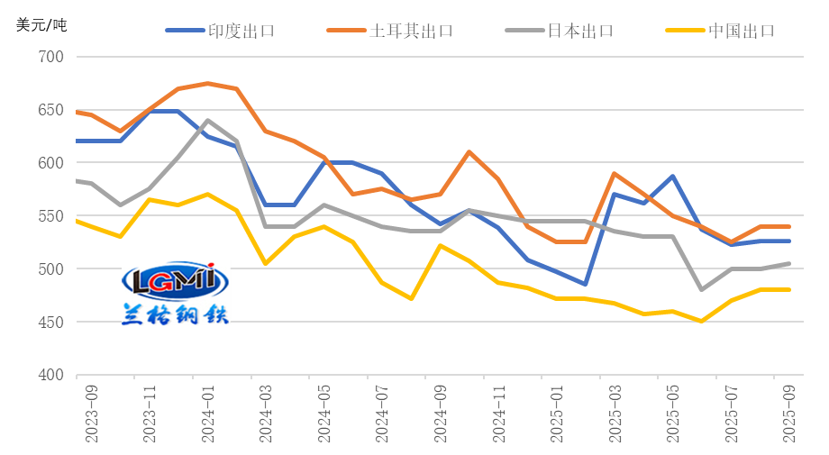 2025年8月份,我國鋼材出口同比呈微幅增長態(tài)勢(詳見圖1),環(huán)比有所回落,較上月減少32.6萬噸,環(huán)比下降3.3%,鋼材進(jìn)口雖環(huán)比有所回升、同比降幅收窄,但仍處于低位水平,因而8月份我國鋼材對外貿(mào)易仍保持明顯凈出口態(tài)勢,但凈出口同比增速大幅回落。蘭格鋼鐵研究中心測算數(shù)據(jù)顯示,8月份,我國凈出口鋼材901.0萬噸,同比增長0.2%,增速較上月回落27.8個百分點;1-8月份,我國凈出口鋼材7351.3萬噸,同比增長11.5%,增速較上月回落1.5個百分點。當(dāng)前我國鋼材出口仍保持價格優(yōu)勢,全球制造業(yè)指數(shù)回升,制造業(yè)外需景氣度略有改善,鋼鐵企業(yè)出口訂單指數(shù)回升至擴(kuò)張區(qū)間,短期內(nèi)對鋼材出口有一定拉動;但全球粗鋼產(chǎn)量有所回升,疊加貿(mào)易摩擦及相關(guān)稅費增加仍將抑制鋼材出口。在上年同期鋼材出口基數(shù)繼續(xù)增加(2024年9月鋼材出口1015萬噸)的情況下,9月份我國鋼材出口同比或面臨回落壓力。相關(guān)影響因素分析如下:1、我國鋼鐵出口價格優(yōu)勢仍存當(dāng)前我國鋼材出口價格優(yōu)勢仍存。蘭格鋼鐵研究中心監(jiān)測數(shù)據(jù)顯示,截至2025年9月8日,印度、土耳其、日本熱軋卷板出口報價(FOB)分別為525美元/噸、540美元/噸和505美元/噸,中國熱軋卷板出口報價(FOB)為480美元/噸;目前我國熱卷出口報價分別較印度、土耳其、日本低45美元/噸、60美元/噸和25美元/噸(詳見圖2)。