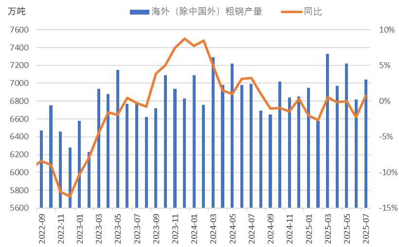 2、海外鋼鐵供應(yīng)由降轉(zhuǎn)升,我國鋼材出口空間有所抑制2025年7月份全球粗鋼產(chǎn)量繼續(xù)呈現(xiàn)同比下降態(tài)勢。7月全球70個納入世界鋼鐵協(xié)會統(tǒng)計國家的粗鋼產(chǎn)量為1.501億噸,同比下降1.3%。從中國以外粗鋼產(chǎn)量來看,同比由降轉(zhuǎn)升,蘭格鋼鐵研究中心監(jiān)測數(shù)據(jù)顯示,7月份,中國以外全球其他地區(qū)產(chǎn)量為7040萬噸,同比增長0.7%(詳見圖3)。海外供應(yīng)由降轉(zhuǎn)升,我國鋼材外部需求空間有所抑制。
