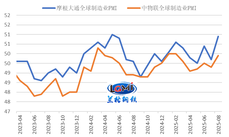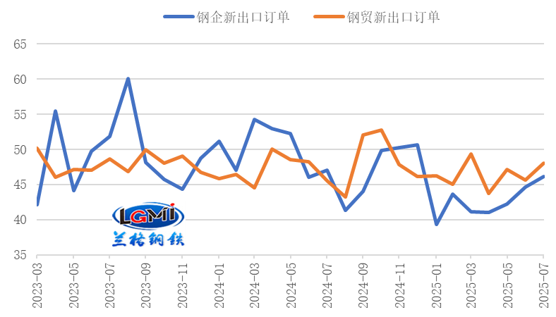 4、我國鋼鐵企業(yè)出口訂單指數(shù)回升至擴(kuò)張區(qū)間從鋼材出口訂單來看,我國鋼鐵企業(yè)出口訂單指數(shù)繼續(xù)回升至擴(kuò)張區(qū)間;中物聯(lián)鋼鐵物流專業(yè)委員會調(diào)查的2025年8月份鋼鐵企業(yè)新出口訂單指數(shù)為50.4%,較上月回升4.3個百分點(詳見圖5);中金協(xié)&蘭格鋼鐵網(wǎng)調(diào)研的鋼鐵流通企業(yè)新出口訂單指數(shù)為46.6%,較上月回落1.5個百分點。鋼鐵企業(yè)出口訂單指數(shù)回升至擴(kuò)張區(qū)間,將對我國后期鋼材出口有所帶動。