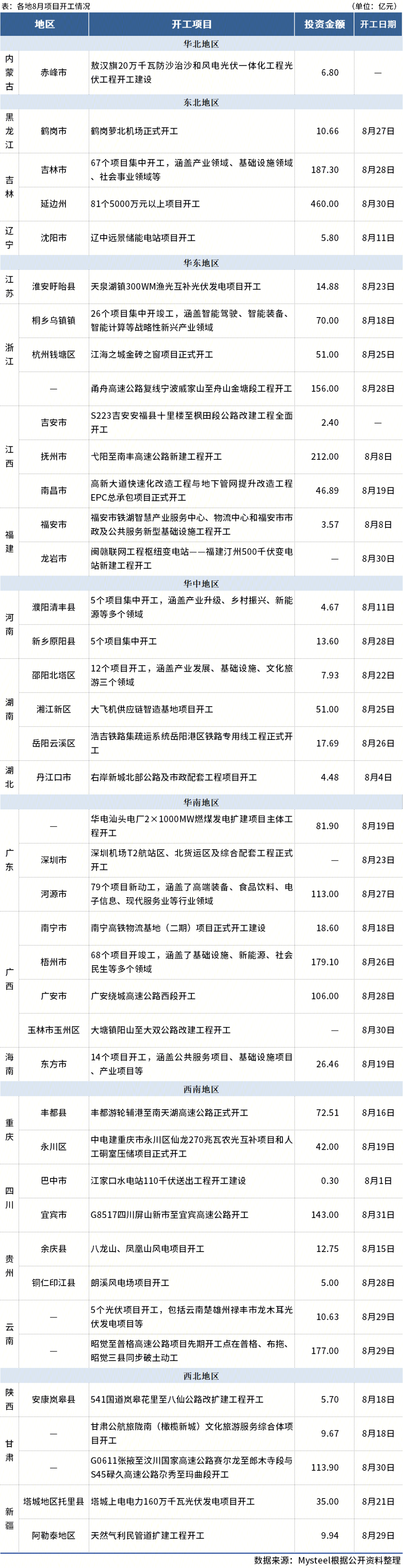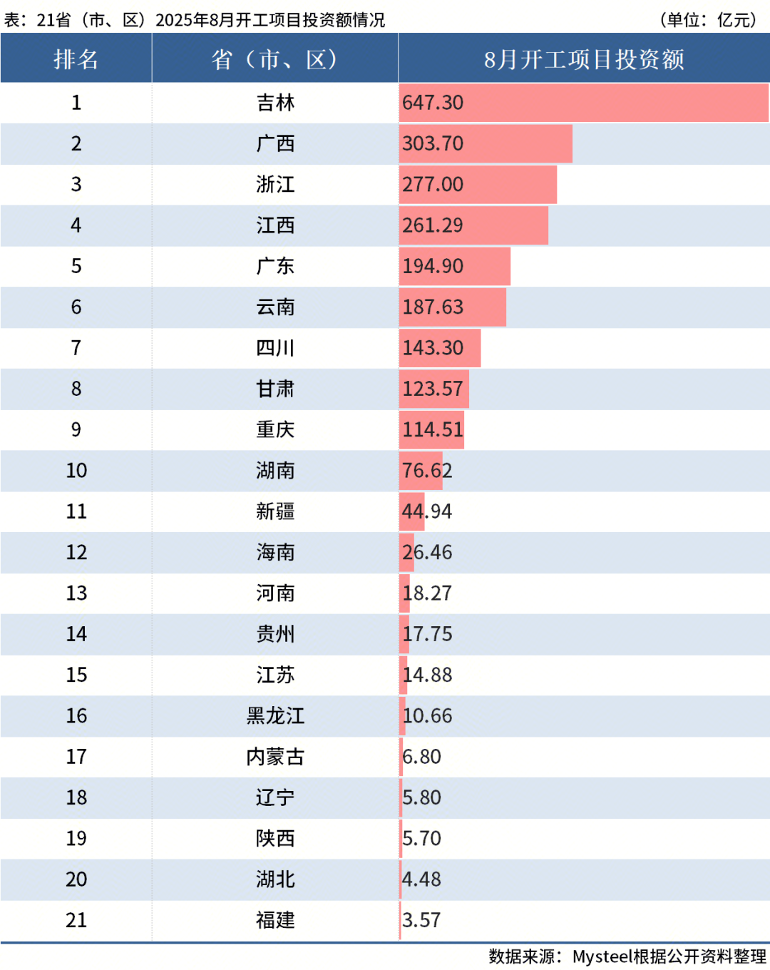 資料顯示,8月,開(kāi)工投資排名前三的省份為吉林、廣西、浙江,總投資分別為647.3億元、303.7億元、277.0億元。