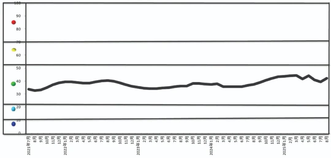 中國銅產業(yè)月度景氣指數監(jiān)測模型結果顯示,2025年8月份,中國銅產業(yè)月度景氣指數為42.0,較上月上升2.7個百分點,繼續(xù)保持在“正常”區(qū)間運行;先行指數為79.6,較上月下降0.1個百分點;一致指數為78.2,較上月上升4.4個百分點。最近13個月中國銅產業(yè)月度景氣指數見下表。