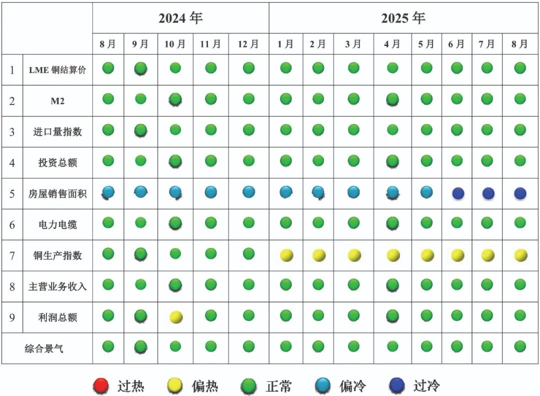 由圖2中國銅產業(yè)景氣信號燈圖可見,8月份,在構成中國銅產業(yè)月度景氣指數的所有9項指標中,共7項指標位于“正常”區(qū)間;銅生產指數1項指標位于“偏熱”區(qū)間;房屋銷售面積指數1項指標處于“過冷”區(qū)間。