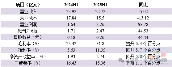綜評:2025年上半年,上峰水泥實現(xiàn)營業(yè)收入22.72億元,同比下降5.02%;歸母凈利潤2.47億元,同比增長44.53%。今年上半年,上峰水泥持續(xù)推進“一主兩翼”發(fā)展戰(zhàn)略,水泥建材主業(yè)盈利能力保持行業(yè)領(lǐng)先地位,新經(jīng)濟股權(quán)投資業(yè)務繼續(xù)擴大,持續(xù)貢獻正向投資收益。