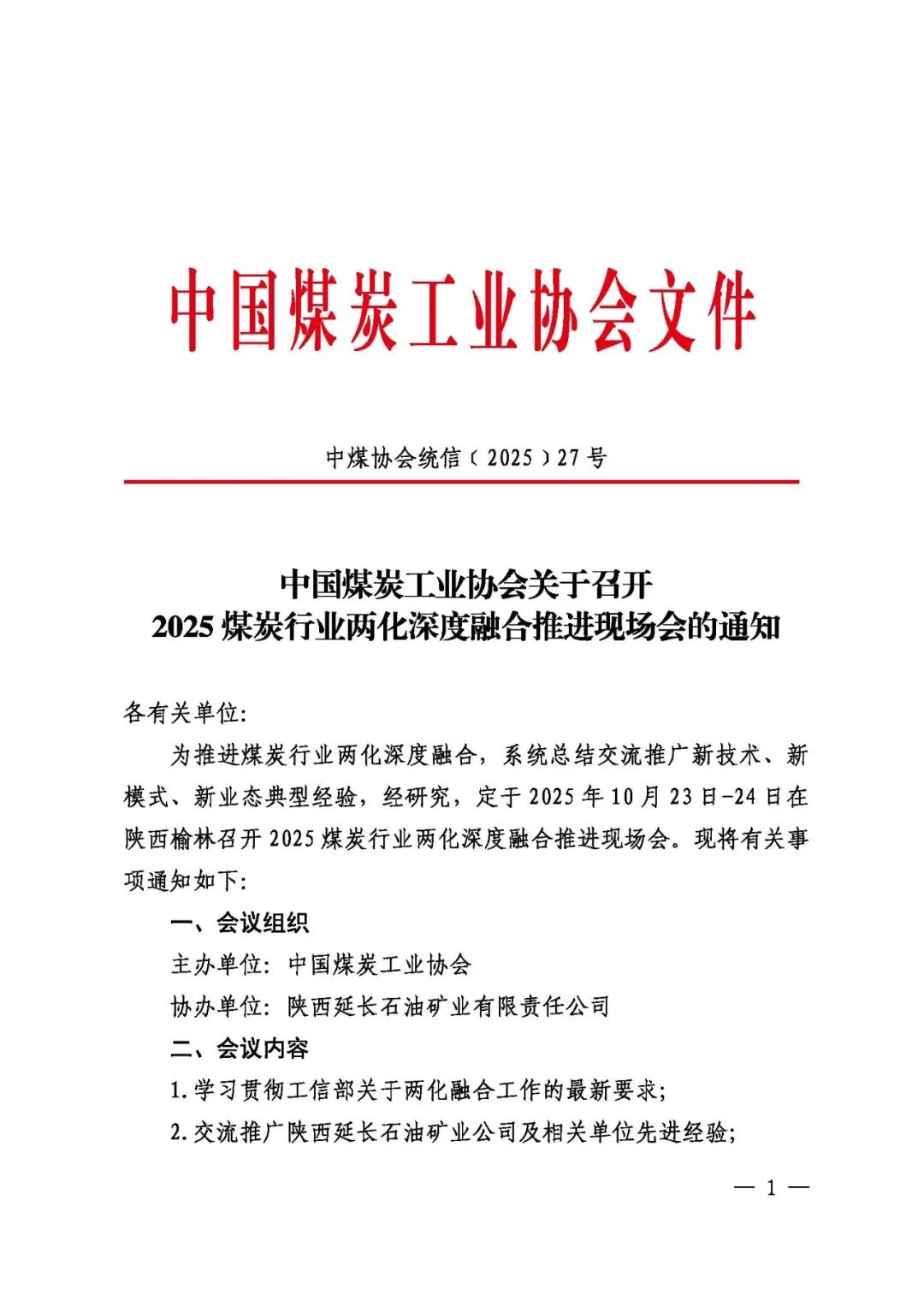 中國煤炭工業(yè)協(xié)會關(guān)于召開2025煤炭行業(yè)兩化深度融合推進(jìn)現(xiàn)場會的通知