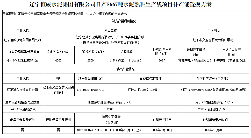 按照工業(yè)和信息化部《水泥玻璃行業(yè)產(chǎn)能置換實施辦法》(工信部原〔2024〕206號)有關規(guī)定及水泥行業(yè)產(chǎn)能管理相關政策要求,我廳于2025年9月9日至9月22日對遼寧恒威水泥集團有限公司日產(chǎn)5667噸水泥熟料生產(chǎn)線項目補充產(chǎn)能置換方案進行了公示,公示期間未收到異議,現(xiàn)予通告。