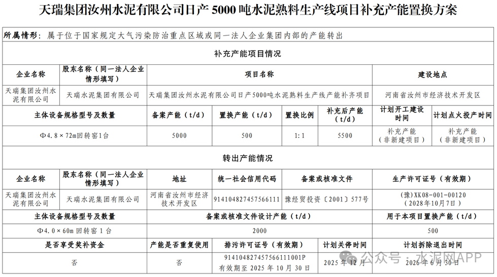 天瑞集團汝州水泥轉出一條2000t/d熟料生產線,其中500t/d產能用于補充同廠區(qū)一條5000t/d熟料生產線,置換比例1:1,1500t/d用于補充天瑞集團南召水泥一條4500t/d產能,置換比例1.5:1。