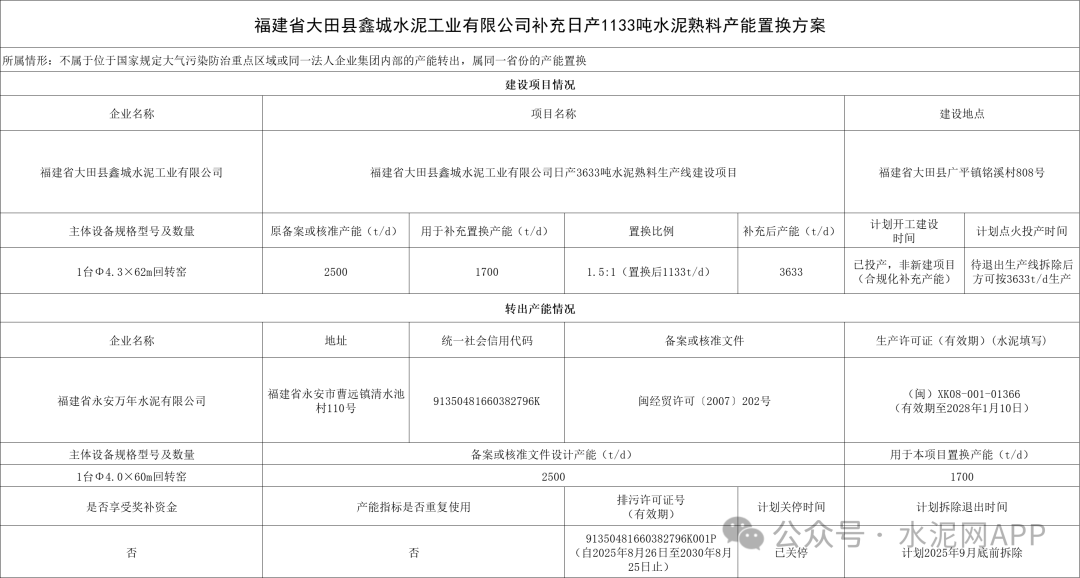 置換方案顯示,福建省大田縣鑫城水泥2500t/d補充產(chǎn)能1700t/d,補充后產(chǎn)能為3633t/d,退出產(chǎn)能來自福建省永安萬年水泥一條2500t/d熟料生產(chǎn)線(用于本項目1700t/d),置換比例1.5:1。