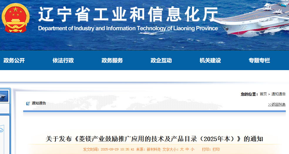 按照《遼寧省人民政府辦公廳關(guān)于推進(jìn)菱鎂行業(yè)高質(zhì)量發(fā)展的實(shí)施意見(jiàn)》(遼政辦發(fā)〔2023〕15號(hào))精神,為持續(xù)搭建技術(shù)交流平臺(tái),推動(dòng)新技術(shù)、新產(chǎn)品成果轉(zhuǎn)化,加快菱鎂行業(yè)發(fā)展形成新質(zhì)生產(chǎn)力,深入推進(jìn)行業(yè)高質(zhì)量發(fā)展,省工業(yè)和信息化廳組織征集已經(jīng)進(jìn)入或接近產(chǎn)業(yè)化應(yīng)用階段的新技術(shù)、新產(chǎn)品,經(jīng)相關(guān)專(zhuān)家論證、廳門(mén)戶(hù)網(wǎng)站公示后,編制形成《菱鎂產(chǎn)業(yè)鼓勵(lì)推廣應(yīng)用的技術(shù)及產(chǎn)品目錄(2025年本)》,現(xiàn)予發(fā)布。請(qǐng)做好目錄的推廣應(yīng)用和指導(dǎo)。