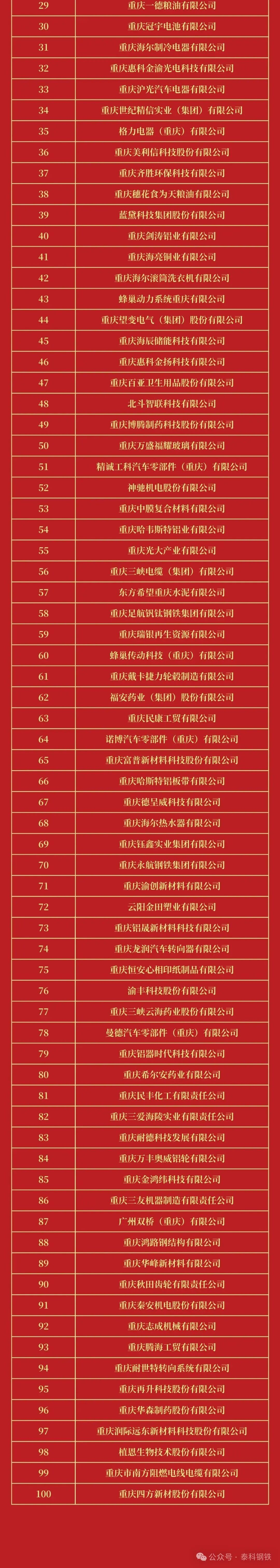 9月19日,重慶市工商聯(lián)、市發(fā)改委、市經(jīng)信委舉辦“2025重慶民營企業(yè)100強發(fā)布會”會上,2025重慶民營企業(yè)100強和2025重慶制造業(yè)民營企業(yè)100強榜單正式發(fā)布。鋼鐵、冶金行業(yè),賽博礦業(yè)、萬達薄板、攀華板材等上榜民營企業(yè)100強,足航釩鈦鋼鐵、永航鋼鐵集團等上榜制造業(yè)民營企業(yè)100。