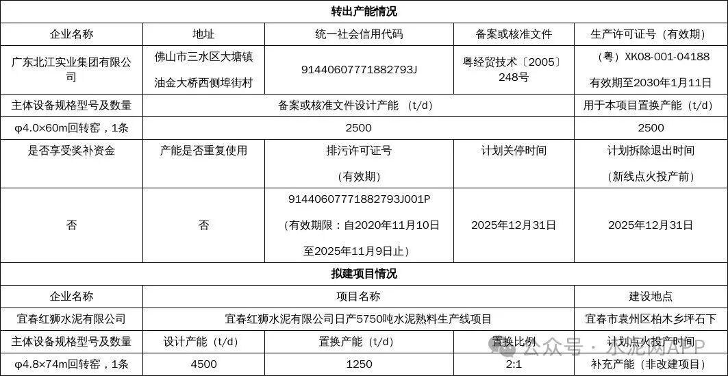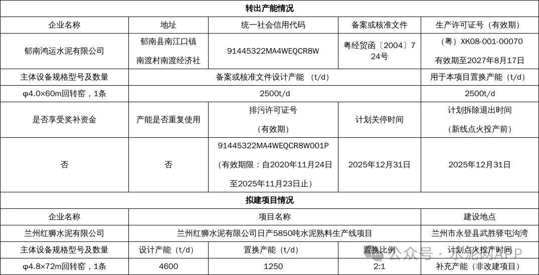 置換方案顯示,廣東北江實業(yè)集團轉(zhuǎn)出一條2500t/d熟料生產(chǎn)線,用于補充宜春紅獅水泥一條4500t/d熟料線,補充后產(chǎn)能為5750t/d。郁南鴻運水泥轉(zhuǎn)出一條2500t/d熟料生產(chǎn)線,用于補充蘭州紅獅水泥一條4600t/d熟料線,補充后產(chǎn)能為5850t/d。