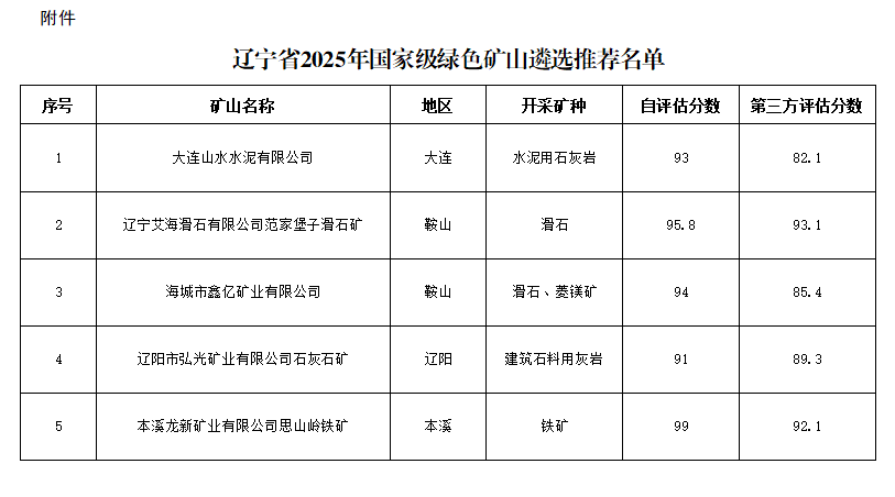 按照《關(guān)于進(jìn)一步加強(qiáng)綠色礦山建設(shè)的通知》(自然資規(guī)〔2024〕1號(hào))和《自然資源部辦公廳關(guān)于開展新一批國家級(jí)綠色礦山遴選工作的通知》(自然資辦發(fā)〔2025〕8號(hào))相關(guān)要求,遼寧省自然資源廳嚴(yán)格組織開展國家級(jí)綠色礦山遴選推薦工作。經(jīng)企業(yè)自主申報(bào)、省廳綜合評(píng)審,現(xiàn)擇優(yōu)確定5家企業(yè)作為2025年國家級(jí)綠色礦山遴選推薦對(duì)象,具體名單詳見附件。