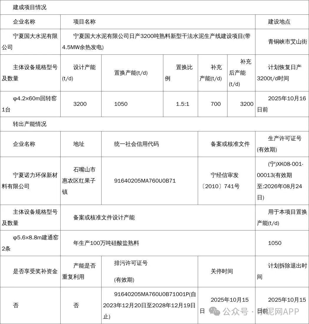 9月29日,寧夏回族自治區(qū)工業(yè)和信息化廳發(fā)布公告,按照工業(yè)和信息化部《水泥玻璃行業(yè)產(chǎn)能置換實施辦法(2024年本)》(工信部原〔2024〕206號)有關(guān)要求,經(jīng)現(xiàn)場核查驗收,寧夏諾力環(huán)保新材料有限公司產(chǎn)能出讓轉(zhuǎn)移至寧夏國大水泥有限公司的水泥熟料生產(chǎn)線,主體設(shè)備已拆除,不具備恢復(fù)生產(chǎn)熟料能力,現(xiàn)予公告。