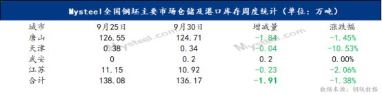 表一: Mysteel全國鋼坯主要市場倉儲及港口庫存周度統(tǒng)計