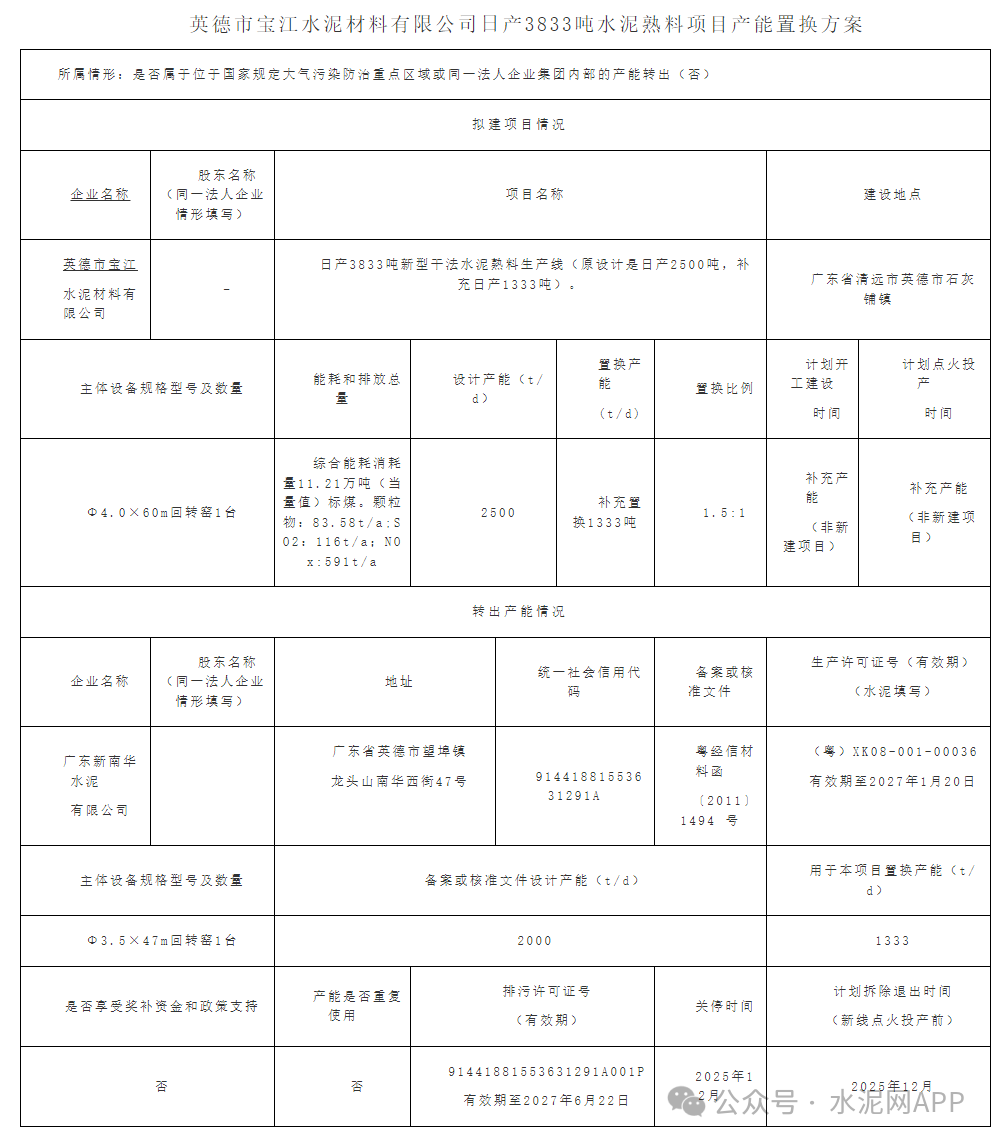 置換方案顯示,英德市寶江水泥2500t/d生產(chǎn)線補充產(chǎn)能1333t/d,補充后產(chǎn)能達(dá)3833t/d,退出產(chǎn)能來自廣東新南華水泥有限公司一條2000t/d生產(chǎn)線,置換比例1.5:1。