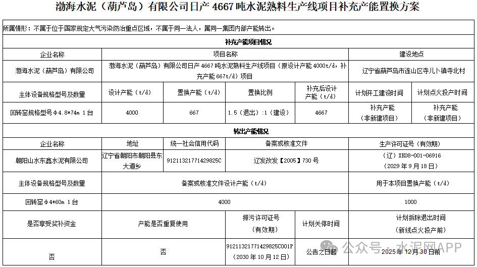 一、朝陽(yáng)山水東鑫水泥有限公司退出一條4000t/d產(chǎn)能(用于本項(xiàng)目1000t/d)至渤海水泥(葫蘆島)有限公司,用于補(bǔ)充原4000t/d熟料線產(chǎn)能至4667t/d,置換比例1.5∶1。