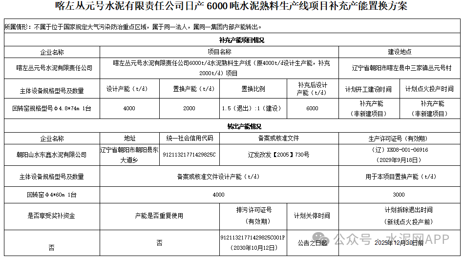 二、朝陽(yáng)山水東鑫水泥有限公司退出一條4000t/d產(chǎn)能(用于本項(xiàng)目3000t/d)至喀左叢元號(hào)水泥有限責(zé)任公司,用于補(bǔ)充原4000t/d熟料線產(chǎn)能至6000t/d,置換比例1.5∶1。