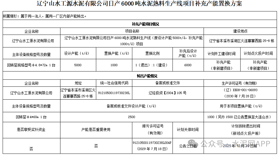 遼寧山水工源水泥有限公司原2500t/d熟料線剩余1500t/d產(chǎn)能已公告出讓至大連山水,山水工源2500t/d生產(chǎn)線公告之日起關(guān)停,2025年12月30日前拆除退出。