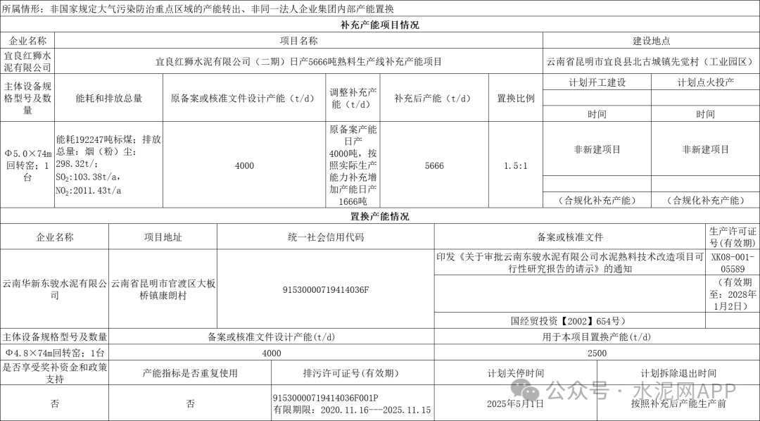 置換方案顯示,宜良紅獅水泥4000t/d熟料生產(chǎn)線補(bǔ)充產(chǎn)能1666t/d,補(bǔ)充后產(chǎn)能5666t/d,退出產(chǎn)能來自云南華新東駿水泥有限公司4000t/d熟料線(用于本項(xiàng)目2500t/d),置換比例1.5:1。