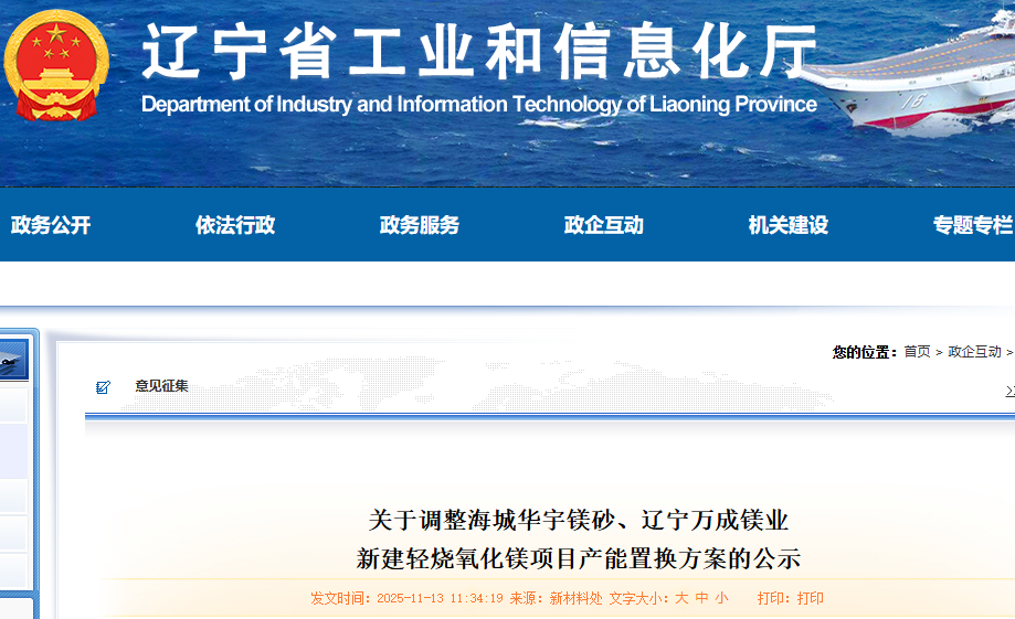 遼寧省工信廳2025年6月19日《關(guān)于海城鎂礦集團有限公司等企業(yè)新建輕燒氧化鎂項目產(chǎn)能置換方案的通告》中海城華宇鎂砂有限公司一期新建年產(chǎn)10萬噸輕燒氧化鎂懸浮窯建設(shè)項目產(chǎn)能置換方案、海城華宇鎂砂有限公司二期新建年產(chǎn)10萬噸輕燒氧化鎂懸浮窯建設(shè)項目產(chǎn)能置換方案、遼寧萬成鎂業(yè)集團有限公司年產(chǎn)20萬噸新建輕燒氧化鎂回轉(zhuǎn)窯項目產(chǎn)能置換方案擬撤銷。