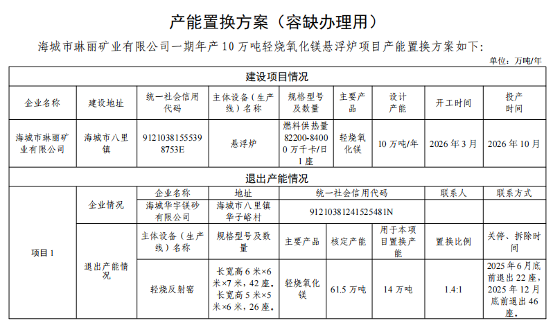 1.海城市琳麗礦業(yè)有限公司一期年產(chǎn)10萬噸輕燒氧化鎂懸浮爐項目產(chǎn)能置換方案