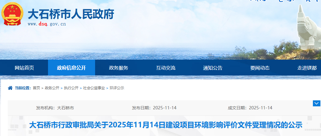 根據(jù)建設(shè)項(xiàng)目環(huán)境影響評(píng)價(jià)審批程序的有關(guān)規(guī)定,2025年11月14日我局受理1個(gè)建設(shè)項(xiàng)目環(huán)境影響評(píng)價(jià)文件?,F(xiàn)將受理情況予以公示,公示期為2025年11月14日-2025年11月18日(3個(gè)工作日)。