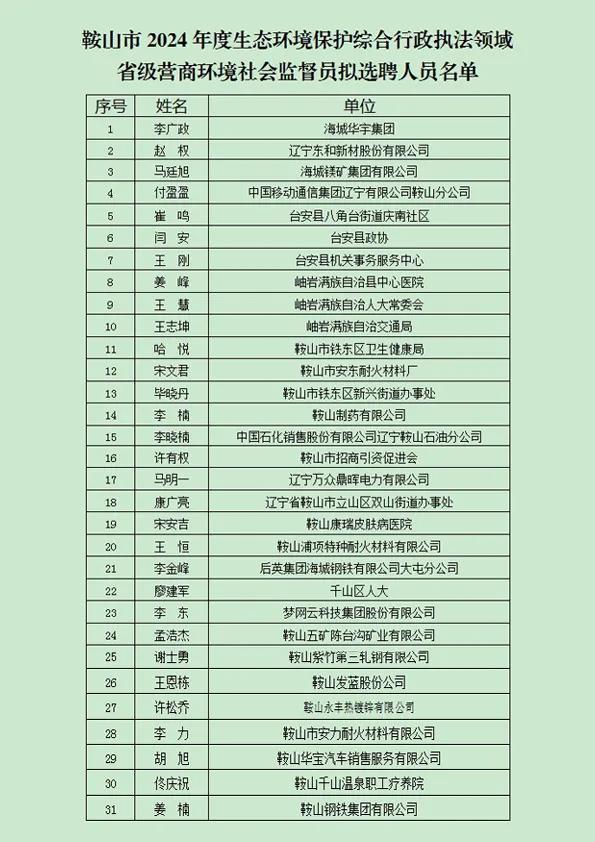 附件:鞍山市2024年度生態(tài)環(huán)境保護(hù)綜合行政執(zhí)法領(lǐng)域省級(jí)營(yíng)商環(huán)境社會(huì)監(jiān)督員擬選聘人員名單