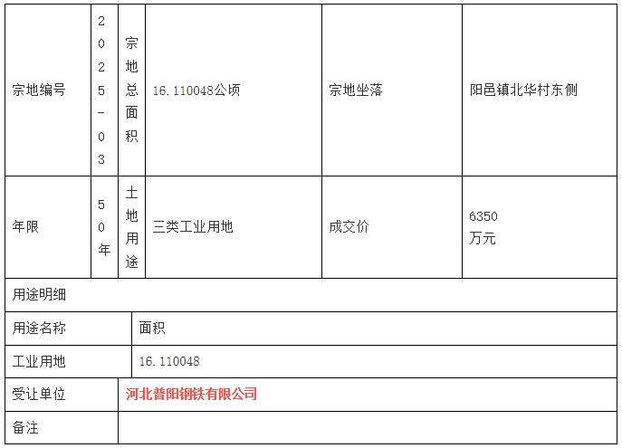 近日,河北普陽(yáng)鋼鐵有限公司以6350萬(wàn)元成功競(jìng)得武安市陽(yáng)邑鎮(zhèn)北華村東側(cè)一宗工業(yè)用地,總面積達(dá)16.110048公頃,使用年限50年。該地塊通過(guò)公開(kāi)掛牌方式出讓?zhuān)稀吨腥A人民共和國(guó)土地管理法》等相關(guān)法規(guī)要求。