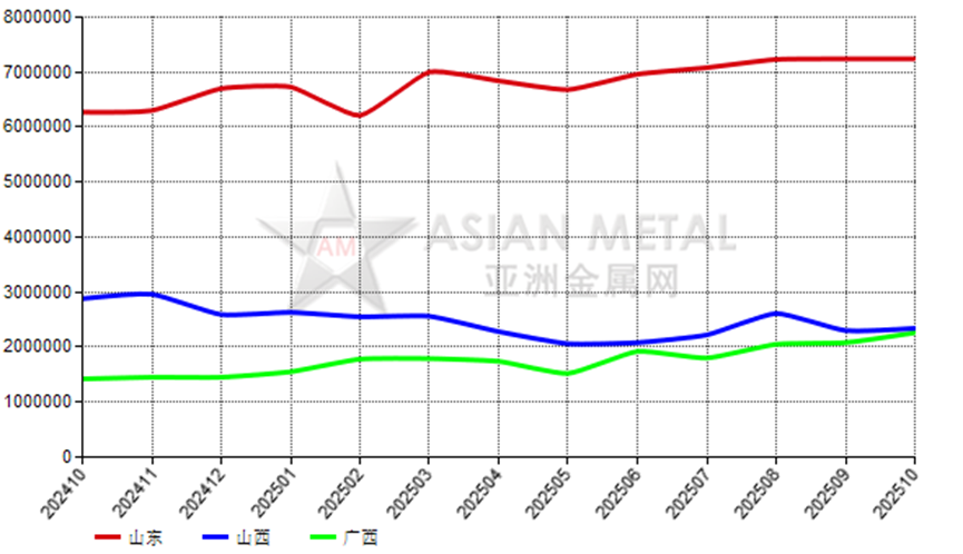 10月份,中國氧化鋁生產(chǎn)商進(jìn)口鋁土礦消費量最大的三個省份為山東、山西和廣西。山東消費進(jìn)口鋁土礦7,240,000.00公噸,同比增長15.47%。山西消費進(jìn)口鋁土礦2,340,000.00公噸,同比下滑18.75%,環(huán)比增長1.74%。廣西消費進(jìn)口鋁土礦2,260,000.00公噸,同比增長59.15%,環(huán)比增長8.65%。