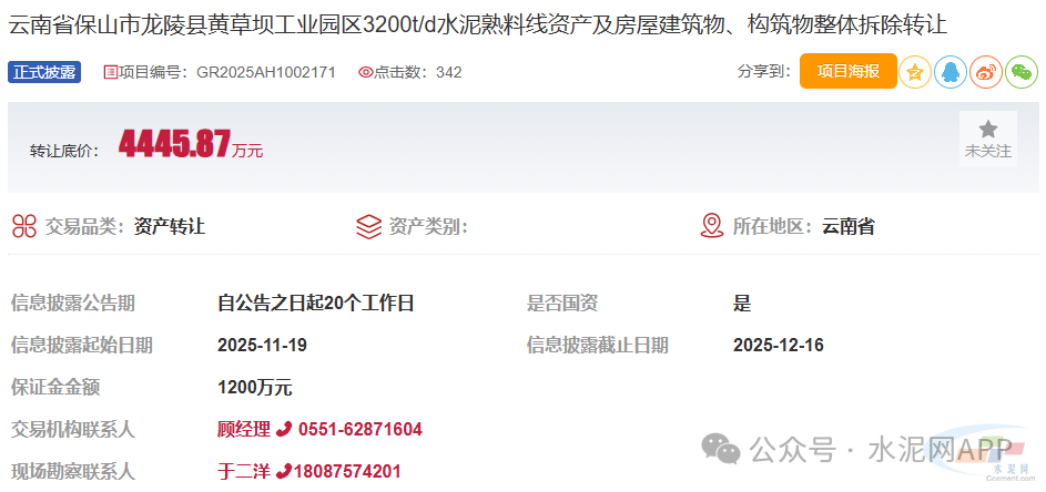 11月19日,據(jù)相關(guān)產(chǎn)權(quán)交易平臺信息顯示,云南省保山市龍陵縣黃草壩工業(yè)園區(qū)3200t/d水泥熟料線資產(chǎn)及房屋建筑物、構(gòu)筑物整體拆除轉(zhuǎn)讓,轉(zhuǎn)讓底價為4445.87萬元。