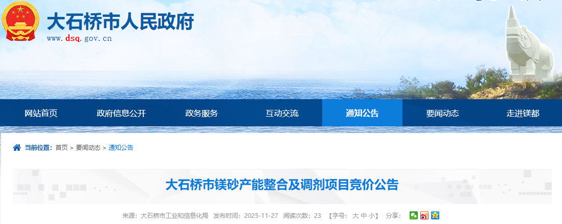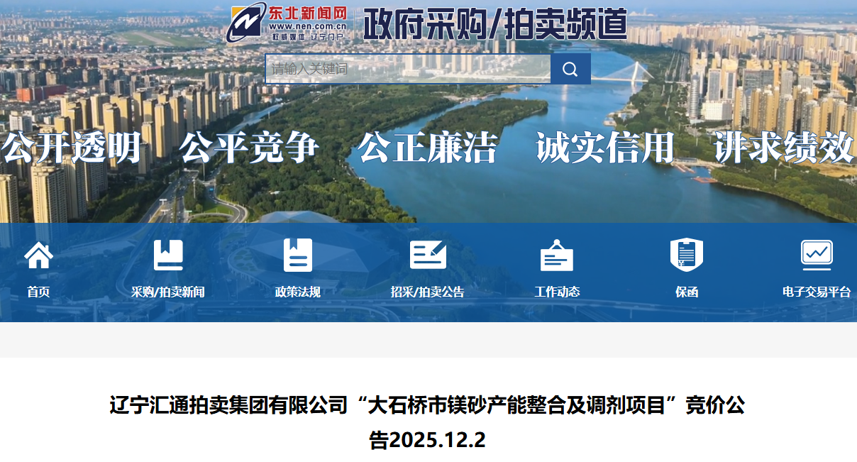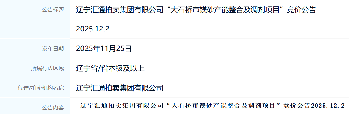 為貫徹落實(shí)大石橋市菱鎂產(chǎn)業(yè)結(jié)構(gòu)調(diào)整與轉(zhuǎn)型升級(jí)的戰(zhàn)略部署,優(yōu)化資源配置,實(shí)現(xiàn)高質(zhì)量發(fā)展。根據(jù)大石橋市鎂砂產(chǎn)能整合及調(diào)劑工作的總體安排,大石橋市政府責(zé)成大石橋市工業(yè)和信息化局委托遼寧匯通拍賣集團(tuán)有限公司,就已列入大石橋市850萬(wàn)噸壓減目標(biāo)以及完成產(chǎn)能整合且已在大石橋市工業(yè)和信息化局報(bào)備的整合方企業(yè),擬于2025年12月2日組織公開競(jìng)價(jià)活動(dòng),以確定產(chǎn)能整合及調(diào)劑的受讓方及補(bǔ)償金額。