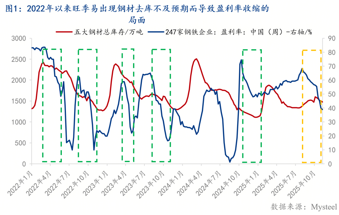 隨著金九銀十旺季逝去,鋼鐵行業(yè)在需求淡季的拖累之下,鋼材去庫壓力已然顯現(xiàn),因此負(fù)反饋邏輯成為當(dāng)前鋼市運(yùn)行的主要邏輯。結(jié)合2022年以來的每年經(jīng)驗(yàn)來看,鋼市負(fù)反饋行情易發(fā)現(xiàn)在旺季時(shí)段(金三銀四和金九銀十期間);那么導(dǎo)致負(fù)反饋行情最根本的原因:我們認(rèn)為在于旺季鋼材去庫不及預(yù)期(下圖1所示)。