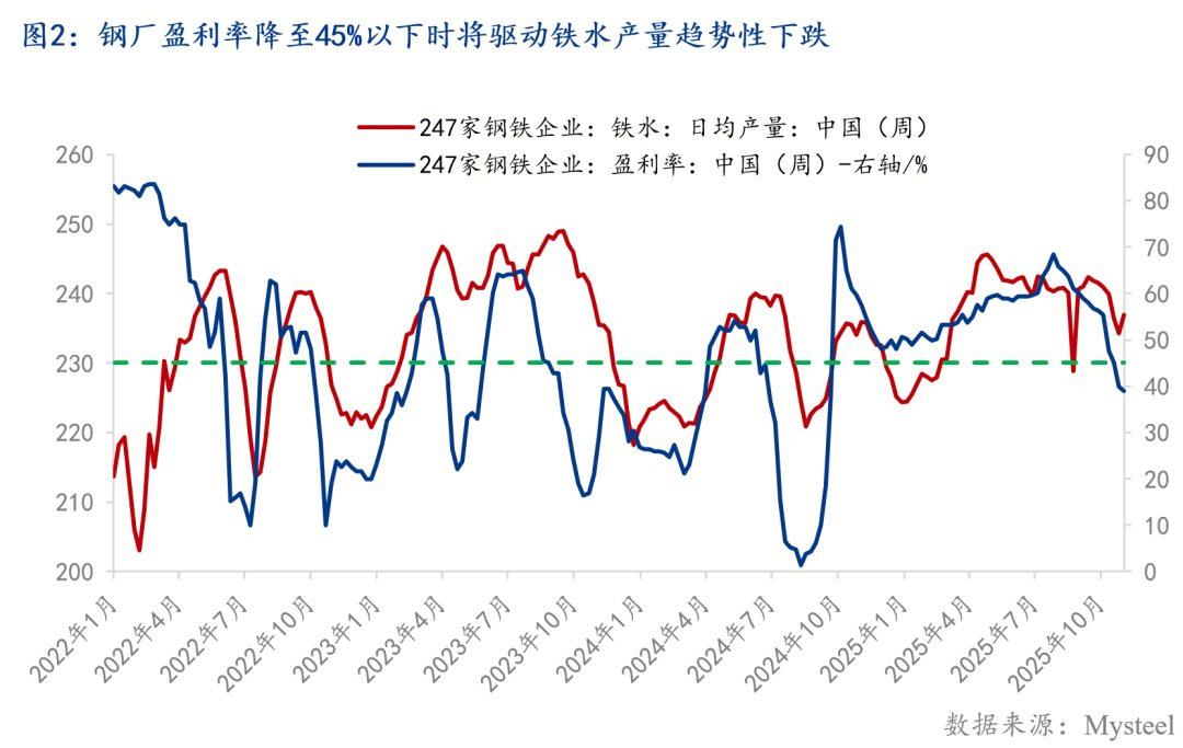 當(dāng)前鋼市運(yùn)行的核心邏輯是負(fù)反饋,根源在于需求淡季下的鋼材去庫壓力,而歷史上鋼市負(fù)反饋行情多發(fā)生在“金三銀四”及“金九銀十”旺季,最根本原因是旺季鋼材去庫不及預(yù)期。歷史規(guī)律顯示,鋼材去庫拐點(diǎn)通常比鋼廠盈利率拐點(diǎn)提前15-30天,核心邏輯是:旺季初期去庫乏力矛盾未顯現(xiàn),鋼廠盈利仍上升;后期去庫乏力引發(fā)市場對供應(yīng)過剩的判斷,進(jìn)而通過打壓利潤倒逼鋼廠減產(chǎn)。鋼市負(fù)反饋觸發(fā)的根本條件是旺季鋼材庫存去化不及預(yù)期,而利潤水平則是決定鋼廠是否減產(chǎn)的直接原因——庫存去化不及預(yù)期會導(dǎo)致鋼廠盈利率下降,降至一定水平后鋼廠將通過減產(chǎn)緩解供應(yīng)壓力。2022年以來的歷史經(jīng)驗(yàn)顯示,當(dāng)鋼市供過于求、庫存去化乏力時(shí),打壓鋼廠利潤倒逼減產(chǎn)是唯一緩解矛盾的途徑,且存在明確規(guī)律:鋼廠盈利率拐點(diǎn)領(lǐng)先鐵水拐點(diǎn)約兩個(gè)月,盈利率降至45%以下鐵水產(chǎn)量才會趨勢下跌,降至10%-25%中樞水平鐵水產(chǎn)量才見底。鋼市負(fù)反饋的核心目標(biāo)是通過倒逼鋼廠減產(chǎn),緩解供應(yīng)過剩導(dǎo)致的鋼材庫存去化乏力問題,評估減產(chǎn)程度的關(guān)鍵指標(biāo)為Mysteel247家日均鐵水產(chǎn)量(與五大鋼材產(chǎn)量存在趨勢相關(guān)性,且今年以來比值均值約為1.93)。以2022-2023年國慶節(jié)后(與今年同期庫存高點(diǎn)相當(dāng)、去庫節(jié)奏雷同)的去庫表現(xiàn)為參考,從去庫速率(今年21萬噸/周vs兩年均值46萬噸/周)和去庫降幅(今年8%vs兩年均值17%)兩個(gè)維度進(jìn)行推算,結(jié)論便是鐵水產(chǎn)量均需從國慶后高點(diǎn)242萬噸/日降至200萬噸/日左右,才能實(shí)現(xiàn)去庫節(jié)奏趨同;然而當(dāng)前鐵水產(chǎn)量在236萬噸/日,理論上仍有36萬噸減產(chǎn)空間。理論推算的鐵水平衡低點(diǎn)200萬噸/日,低于過去四年負(fù)反饋行情下的鐵水最低值213萬噸/日,凸顯今年國慶后鋼材庫存去化動能極度羸弱。但Mysteel排產(chǎn)調(diào)研顯示,未來鐵水低點(diǎn)或在228-230萬噸/日,與理論值存在差距,核心原因在于鋼廠盈利水平。因此,后續(xù)需重點(diǎn)跟蹤鋼廠盈利變化,這是影響減產(chǎn)落地程度及庫存去化進(jìn)程的關(guān)鍵因素。