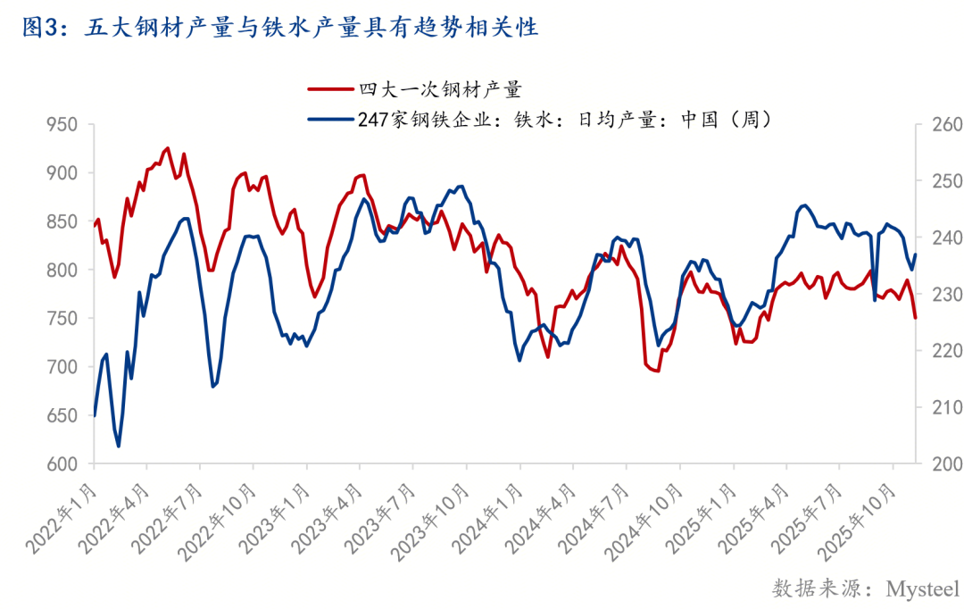 前文論述了鋼市負(fù)反饋觸發(fā)的根本條件——即旺季鋼材庫存去化不及預(yù)期,由于鋼材庫存去化不及預(yù)期驅(qū)動,鋼廠盈利率發(fā)生下降,當(dāng)盈利率下降至一定水平后,鋼廠便會開啟減產(chǎn)以此緩解供應(yīng)壓力,因此可以說利潤水平是決定鋼廠是否減產(chǎn)的直接原因。從2022年以來的四年歷史經(jīng)驗(yàn)來看,每當(dāng)鋼鐵市場出現(xiàn)供過于求庫存去化發(fā)力的矛盾時(shí),負(fù)反饋開啟通過打壓鋼廠利潤倒逼其減產(chǎn)便成為了唯一緩解矛盾的途徑。如下圖2所示,首先從時(shí)間維度來看,減產(chǎn)過程中,鋼廠盈利率拐點(diǎn)一般領(lǐng)先鐵水拐點(diǎn)兩個(gè)月左右;其次,每當(dāng)鋼廠盈利率降至45%以下的水平時(shí),鐵水產(chǎn)量才會開啟趨勢下跌。參考過去四年當(dāng)中的數(shù)次負(fù)反饋行情,只有當(dāng)鋼廠盈利率降至10%-25%的中樞水平時(shí),鐵水產(chǎn)量才會出現(xiàn)見底,因此從當(dāng)前情況來看,鐵水產(chǎn)量或遠(yuǎn)未見底。