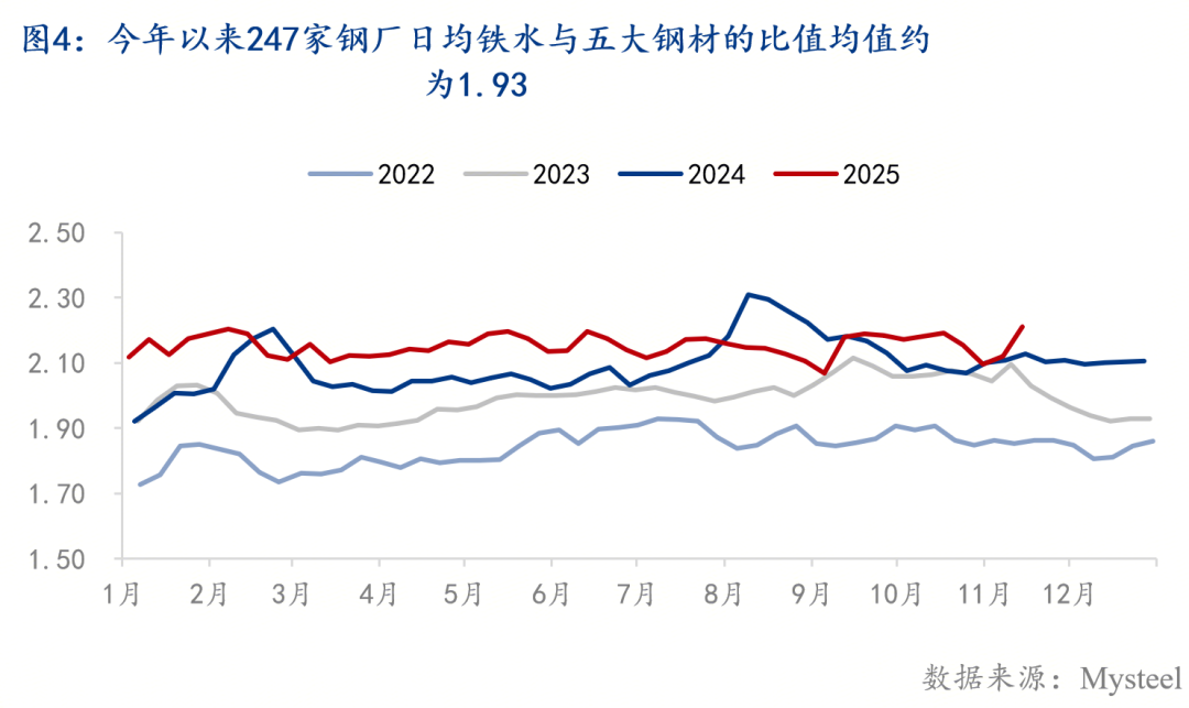 鋼市負(fù)反饋的最終目的在于倒逼鋼廠減產(chǎn),以此緩解供應(yīng)邊際過剩所帶來的鋼材庫存去化乏力的壓力,那么減產(chǎn)需減到何種程度,才能緩解這種壓力呢?產(chǎn)量端,我們通過錨定Mysteel247家日均鐵水產(chǎn)量,以此作為評估減產(chǎn)程度的最終指標(biāo)。首先,由于五大鋼材產(chǎn)量與247家日均鐵水產(chǎn)量之間存在一定的換算關(guān)系:1、兩個(gè)指標(biāo)存在一定的趨勢相關(guān)性(如下圖3);2、今年以來兩者之間的比值均值約為1.93(如下圖4)。因此,根據(jù)上述兩個(gè)指標(biāo)之間的關(guān)系,便可推導(dǎo)出247家日均鐵水產(chǎn)量最終需減至何種水平,來達(dá)到鋼材庫存去化的平衡狀態(tài)。