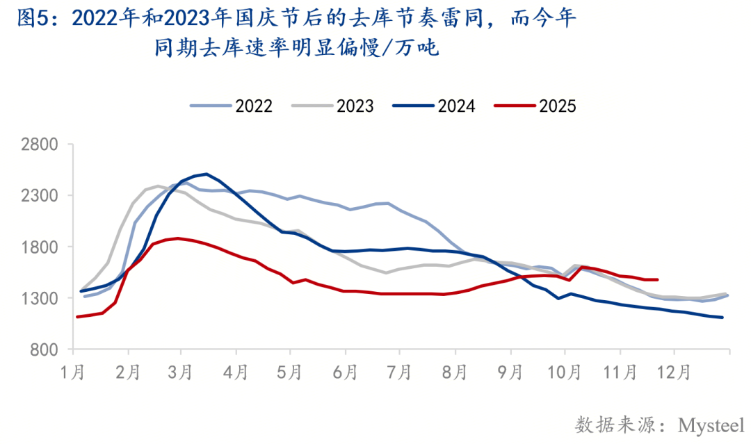 由于今年國慶節(jié)后,五大鋼材總庫存高點(diǎn)與2022年、2023年的同期水平相當(dāng),且2022年和2023年國慶節(jié)后的五大鋼材去庫節(jié)奏雷同(如下圖5),因此我們通過錨定這兩年國慶節(jié)后的去庫節(jié)奏,來判斷今年國慶節(jié)后五大鋼材去庫是否健康。