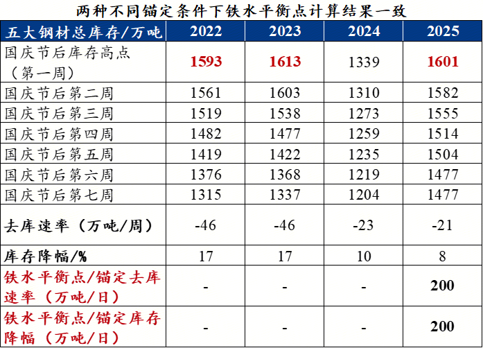 首先,從庫存去庫速率的角度來看:經(jīng)過計(jì)算,今年國慶節(jié)后五大鋼材總庫存從高點(diǎn)1601萬噸降至當(dāng)前水平1477萬噸的過程中,其去庫速率為21萬噸/周;然而,2022年同期去庫速率為46萬噸/周,2023年同樣為46萬噸/周,因此這兩年的去庫速率均值在46萬噸/周??梢钥吹浇衲陣鴳c節(jié)后的去庫速率要少了26萬噸/周,也就說五大鋼材產(chǎn)量相比需求要多出了22萬噸/周;若想要今年國慶節(jié)后的去庫速率與2022年、2023年的去庫速率均值相當(dāng),那么通過推算得出,鐵水產(chǎn)量需要從國慶后的高點(diǎn)242萬噸/日降至約200萬噸/日附近,才能夠?qū)崿F(xiàn)去庫速率的趨同。其次,若從去庫降幅的角度來看:今年國慶節(jié)后五大鋼材總庫存從高點(diǎn)1601萬噸降至當(dāng)前水平1477萬噸的過程中,其降幅為8%;然而,2022年同期降幅為17%,2023年同期降幅為17%,因此這兩年的庫存降幅均值為17%。很顯然,今年的庫存降幅明顯要低于2022年和2023年的同期水平。若錨定這兩年的降幅均值17%,那么經(jīng)過計(jì)算,國慶節(jié)后相同的去庫時(shí)間內(nèi),今年五大鋼材總庫存要少去庫了約153萬噸,也就說五大鋼材產(chǎn)量相比需求要多出了153萬噸。若把多出來的153萬噸轉(zhuǎn)換成鐵水產(chǎn)量,那么鐵水產(chǎn)量需要從國慶后的高點(diǎn)242萬噸/日同樣降至約200萬噸/日附近。在兩種不同的錨定條件下,鐵水平衡點(diǎn)計(jì)算的結(jié)果卻是一樣的,核心原因在于今年與2022年、2023年國慶節(jié)后的庫存高點(diǎn)水平相近。同時(shí),對于當(dāng)前236萬噸/日的日均鐵水而言,理論上仍將有約36萬噸的減產(chǎn)空間。