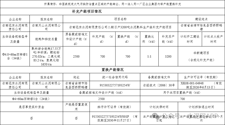 置換方案顯示,云南遠(yuǎn)東水泥退出一條2500t/d熟料生產(chǎn)線,其中700t/d產(chǎn)能用于補(bǔ)充同廠區(qū)另一條2500t/d熟料線,補(bǔ)齊后產(chǎn)能為3200t/d,置換比例1:1。