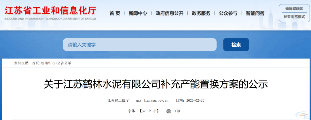 現(xiàn)將江蘇鶴林水泥有限公司補(bǔ)充產(chǎn)能置換方案予以公示,歡迎社會(huì)公眾進(jìn)行監(jiān)督。公示時(shí)間為2026年2月25日至3月9日。公示期間如有異議,請(qǐng)以書面形式向江蘇省工業(yè)和信息化廳反映情況。