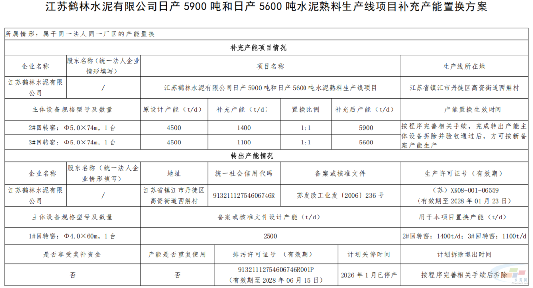 附件:江蘇鶴林水泥有限公司日產(chǎn)5900噸和日產(chǎn)5600噸水泥熟料生產(chǎn)線項(xiàng)目補(bǔ)充產(chǎn)能置換方案