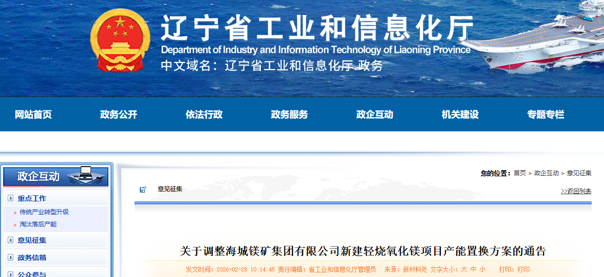 按照《遼寧省人民政府辦公廳關(guān)于推進(jìn)菱鎂行業(yè)高質(zhì)量發(fā)展的實(shí)施意見》(遼政辦發(fā)〔2023〕15號(hào))、《遼寧省菱鎂礦浮選及鎂砂行業(yè)產(chǎn)能置換辦法》(遼工信建材〔2024〕18號(hào))要求,以及菱鎂行業(yè)專項(xiàng)整治工作會(huì)商會(huì)議安排,根據(jù)企業(yè)調(diào)整申請(qǐng)及鞍山市工信局初審,省級(jí)復(fù)核,我廳于2026年2月9日至2月27日,對(duì)海城鎂礦集團(tuán)有限公司新建輕燒氧化鎂項(xiàng)目產(chǎn)能置換方案進(jìn)行了公示,公示期間無異議,現(xiàn)予通告。