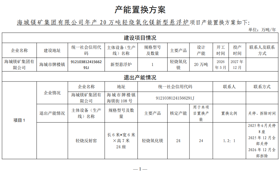 附件:海城鎂礦集團(tuán)有限公司產(chǎn)能置換方案