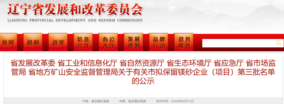 根據(jù)《遼寧省人民政府辦公廳關(guān)于推進菱鎂行業(yè)高質(zhì)量發(fā)展的實施意見》(遼政辦發(fā)〔2023〕15號)、《遼寧省人民政府辦公廳關(guān)于印發(fā)遼寧省菱鎂行業(yè)專項整治方案的通知》(遼政辦發(fā)〔2023〕34號)要求,有關(guān)市政府向省菱鎂行業(yè)高質(zhì)量發(fā)展領(lǐng)導(dǎo)小組辦公室報送了本市擬保留鎂砂企業(yè)(項目)名單,同時對部分已公示項目進行了調(diào)整?,F(xiàn)將相關(guān)企業(yè)(項目)名單有關(guān)情況面向社會公示,公示期5個工作日。
