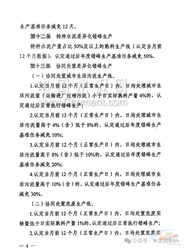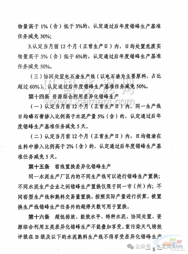 《細(xì)則》指出,有全年協(xié)同處置城市生活垃圾及有毒有害廢棄物等任務(wù)的生產(chǎn)線可以不進(jìn)行錯(cuò)峰生產(chǎn),但要適當(dāng)降4低水泥生產(chǎn)負(fù)荷。 《細(xì)則》提到,同一水泥生產(chǎn)廠區(qū)內(nèi)的不同生產(chǎn)線可以進(jìn)行錯(cuò)峰生產(chǎn)置換;不同水泥生產(chǎn)企業(yè)之間錯(cuò)峰生產(chǎn)置換僅限于同一市(州)內(nèi);不同窯型生產(chǎn)線和熟料交易量置換,按照實(shí)際產(chǎn)量進(jìn)行折算。被置換生產(chǎn)線錯(cuò)峰生產(chǎn)任務(wù)外的超停天數(shù)可用于置換。 《細(xì)則》還明確了,超低排放差異化、能效水平差異化、特種水泥差異化、協(xié)同處置差異化、資源綜合利用差異化、密線置換差異化等六種條件下的錯(cuò)峰生產(chǎn)要求。但超低排放、能效水平、特種水泥、協(xié)同處置、資源綜合利用五類差異化錯(cuò)峰生產(chǎn)不能疊加享受。重污染天氣績(jī)效評(píng)級(jí)在B級(jí)及以下的水泥熟料生產(chǎn)線不得享受差異化錯(cuò)峰生產(chǎn)減免。