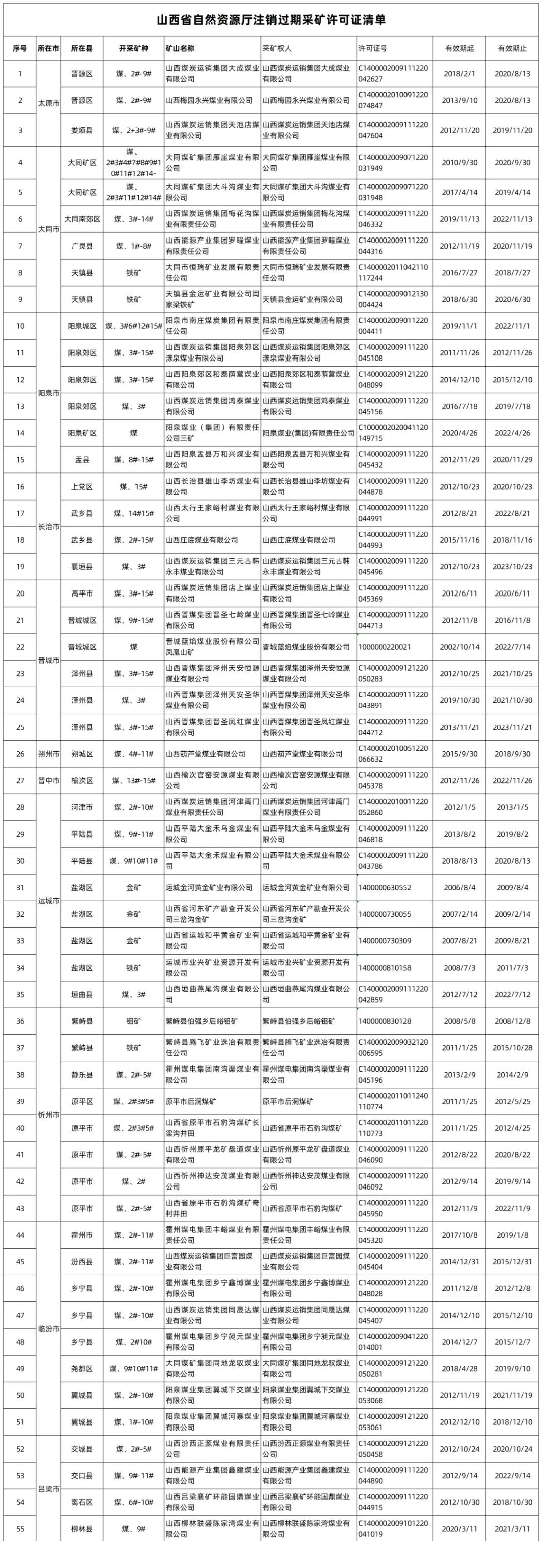 根據(jù)《礦產(chǎn)資源法》《礦產(chǎn)資源開采登記管理辦法》和《自然資源部辦公廳關(guān)于政策性關(guān)閉礦山采礦許可證注銷有關(guān)工作的函》(自然資辦函〔2019〕1574號)《自然資源部關(guān)于進(jìn)一步完善礦產(chǎn)資源勘查開采登記管理的通知》(自然資規(guī)〔2023〕4號)要求,經(jīng)省自然資源廳2024年第9次廳務(wù)會研究,決定對55個過期采礦許可證(詳見附件)予以注銷?,F(xiàn)予公告。